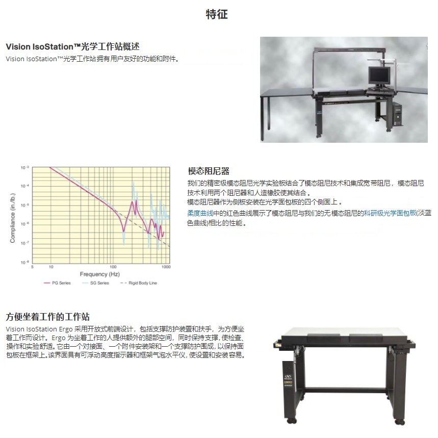 精密級人體工程學Vision IsoStation™光學工作站具有PG系列4.8mm表層模態阻尼光學面包板和I-325氣動隔離器。它們為就座的用戶設計,繼承了原始Vision IsoStation的許多功能。